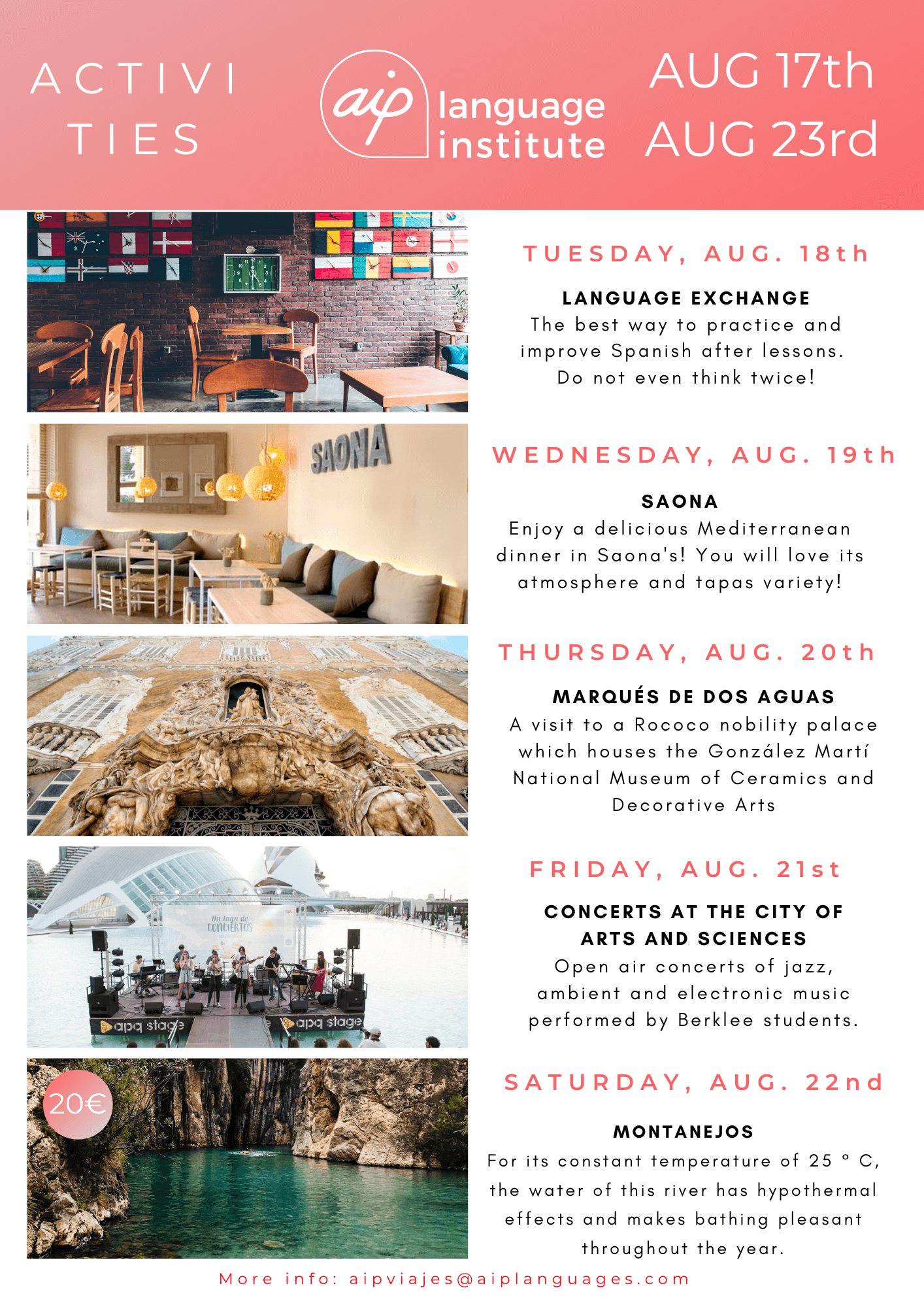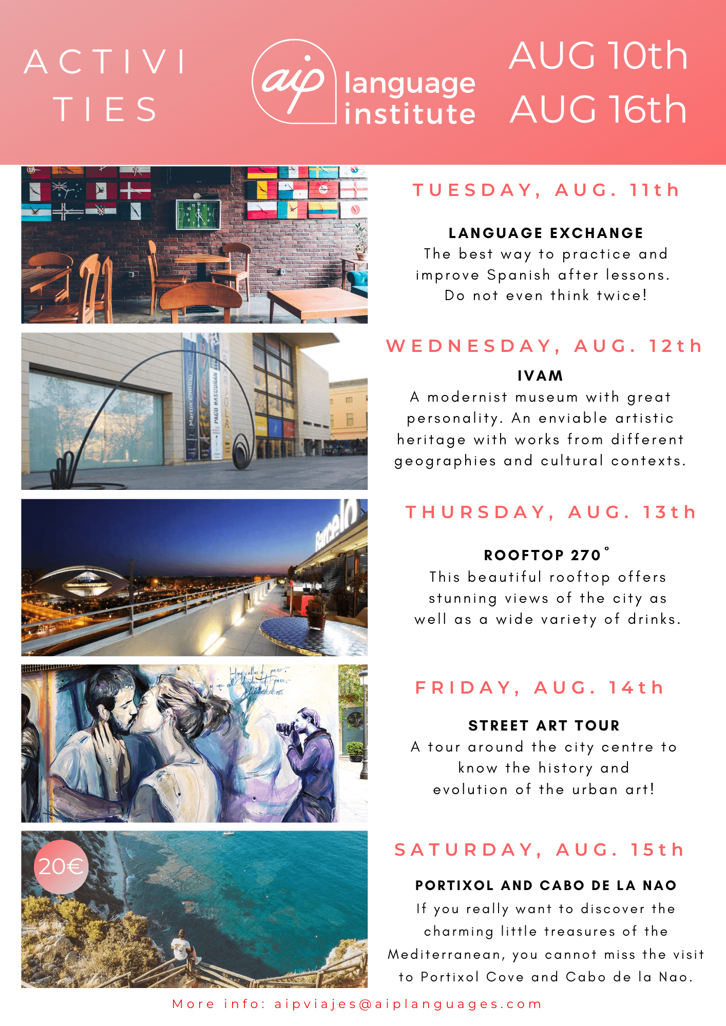 Szkoła Języka Hiszpańskiego AIP organizuje liczne wycieczki do najbardziej ekscytujących miejsc w Walencji, tak aby pomóc zaprzyjaźnić Ci się z twoim nowym otoczeniem. Tygodniowo organizuje się przynajmniej trzy tego typu spotkania popołudniu lub też cały dzień w celu poznania najbardziej skrywanych tajemnic miasta Walencja. Dodatkowo możesz wziąć też udział w wycieczkach weekendowych organizowanychy przez szkołę. Polub nas na Facebooku i śledź nasze dzialania. Warto być na bieżąco z cotygodniowymi wydarzeniami kulturalnymi w szkole AIP.
