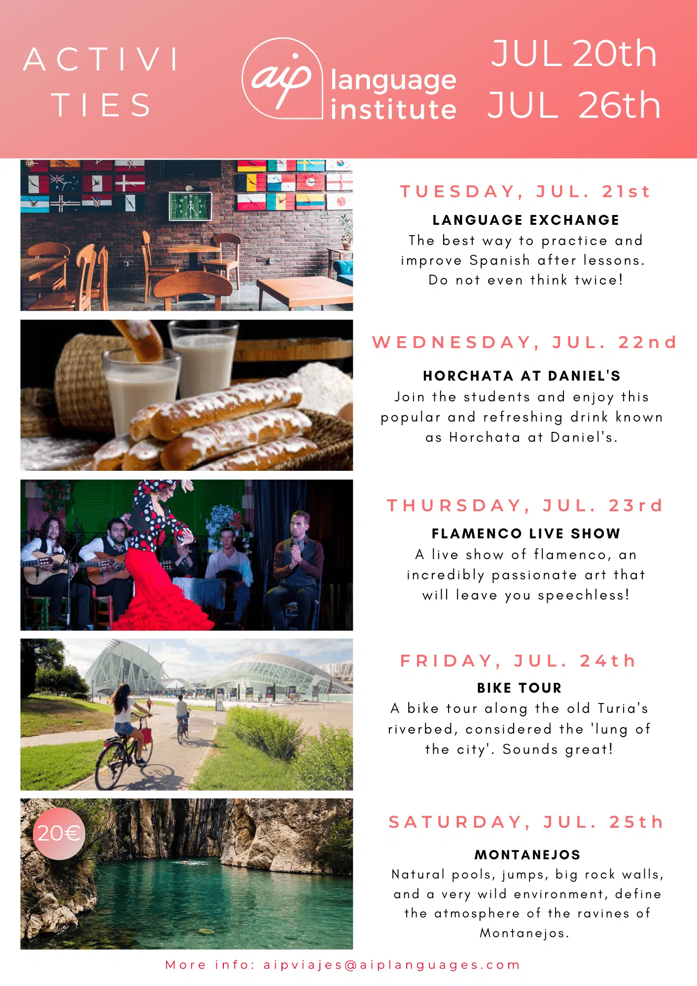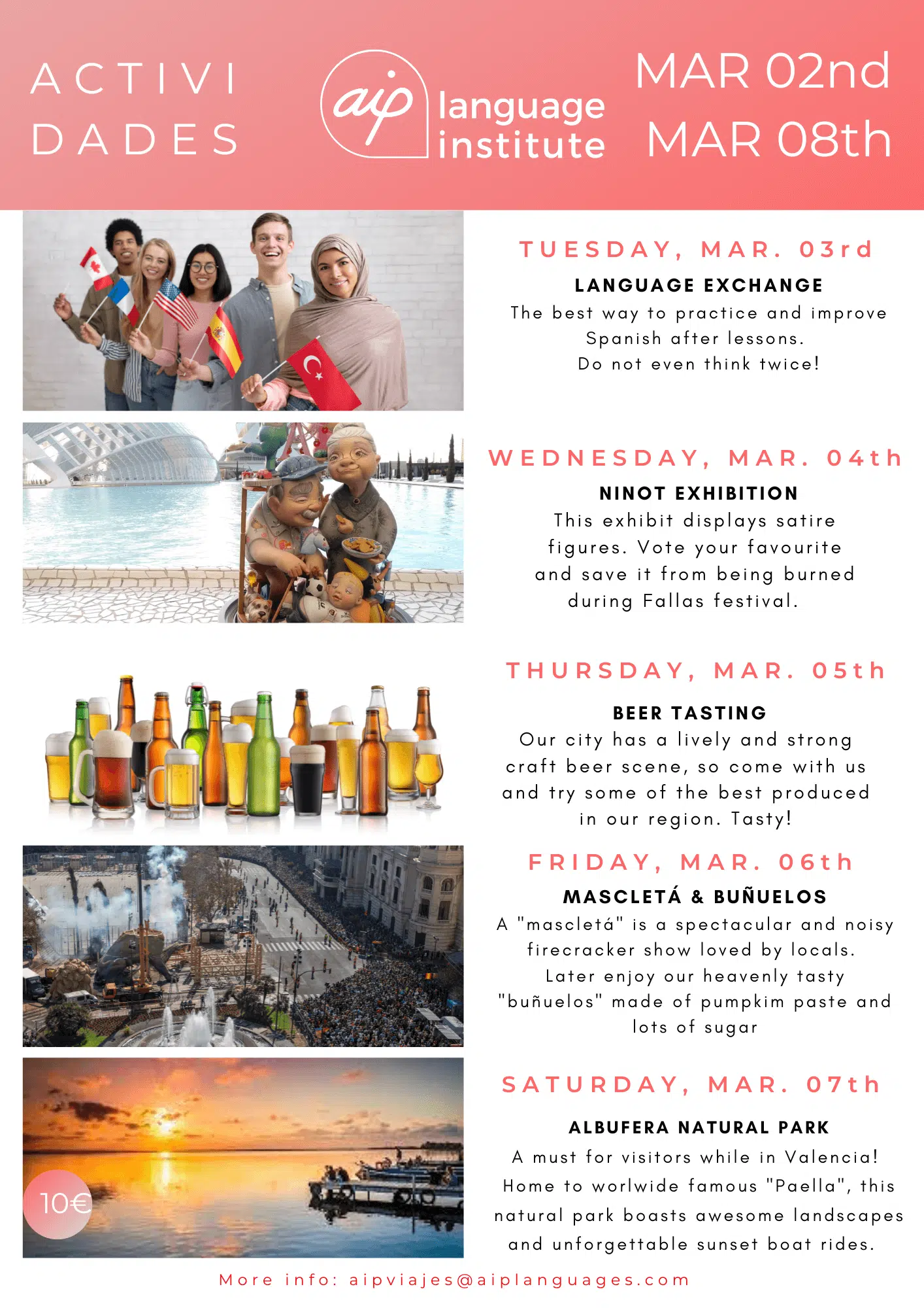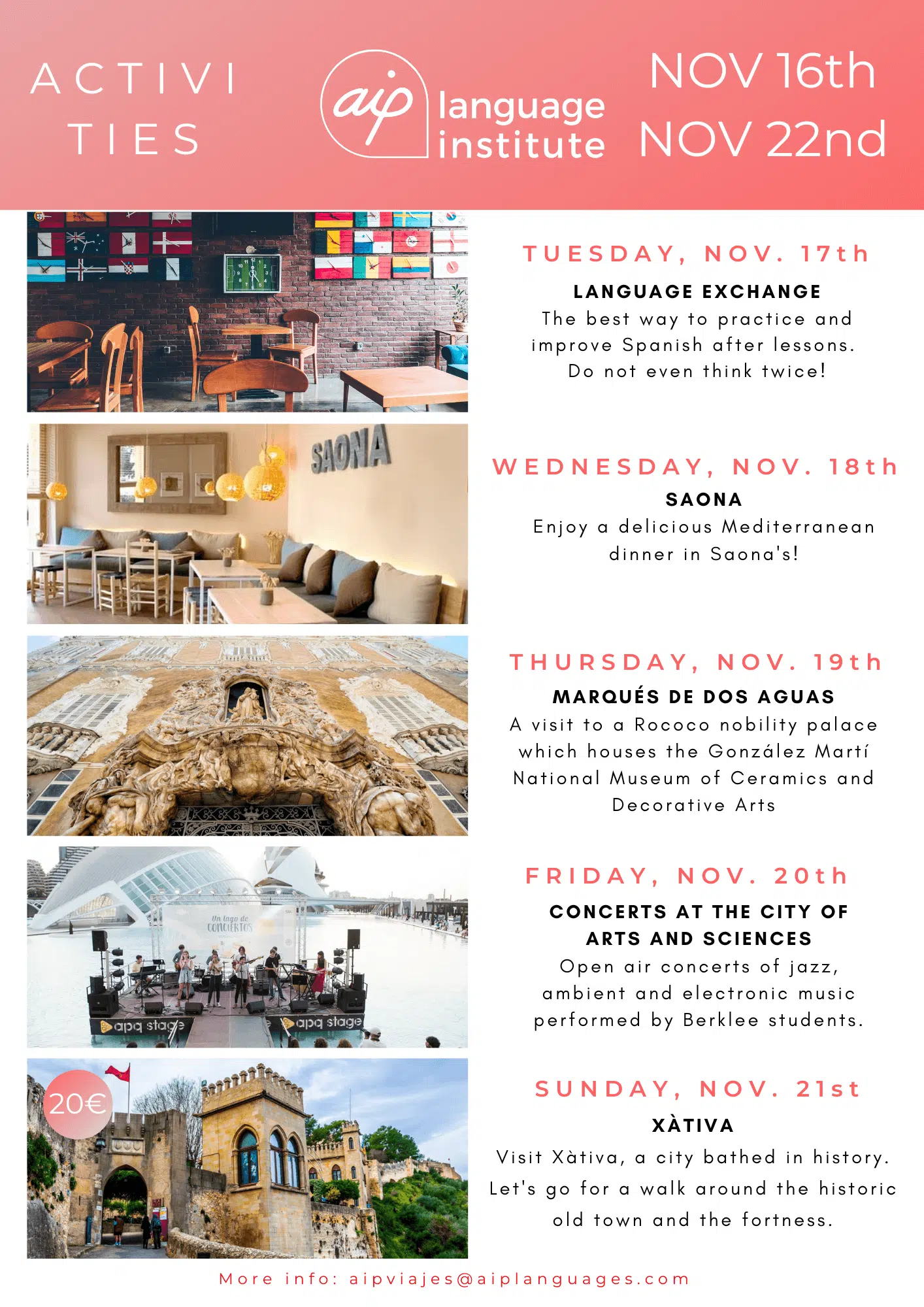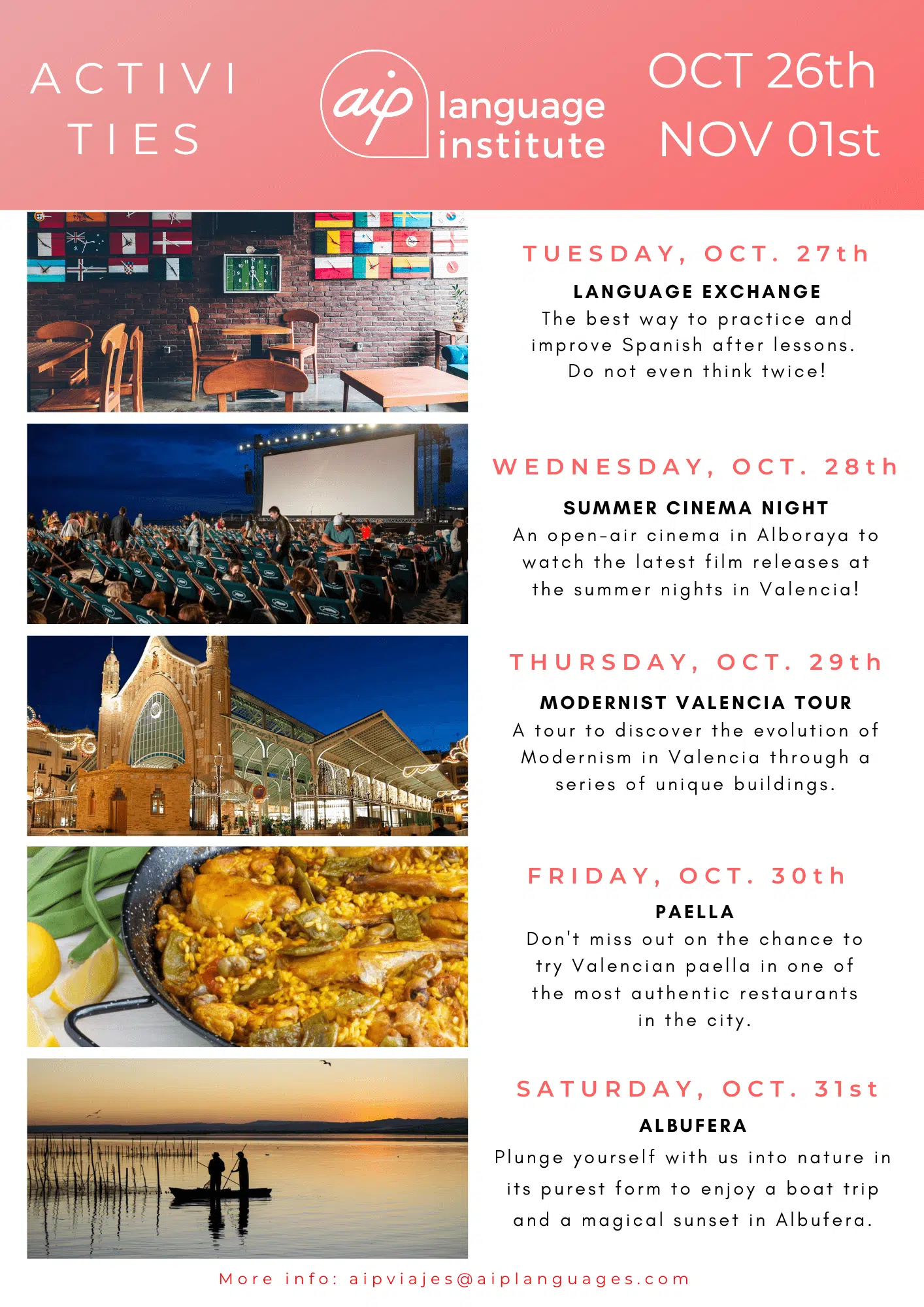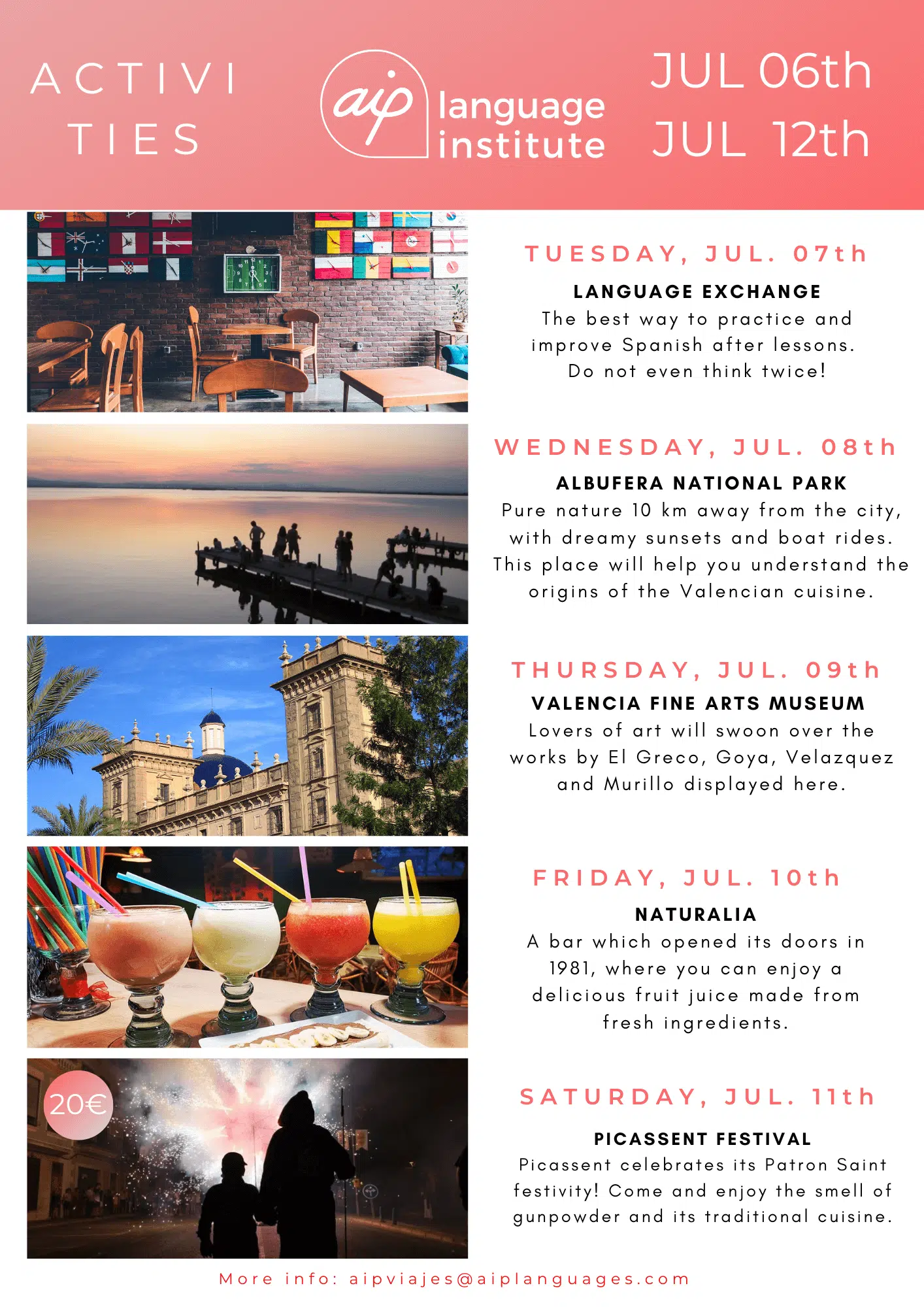 Om du funderar på att komma till Valencia för att studera en av våra kurser eller om du redan har bokat dina kursveckor kan du se vilka aktiviteter vi har organiserat. Klicka dig vidare nedan och upptäck alla överraskningar som vi har i beredskap för dig.