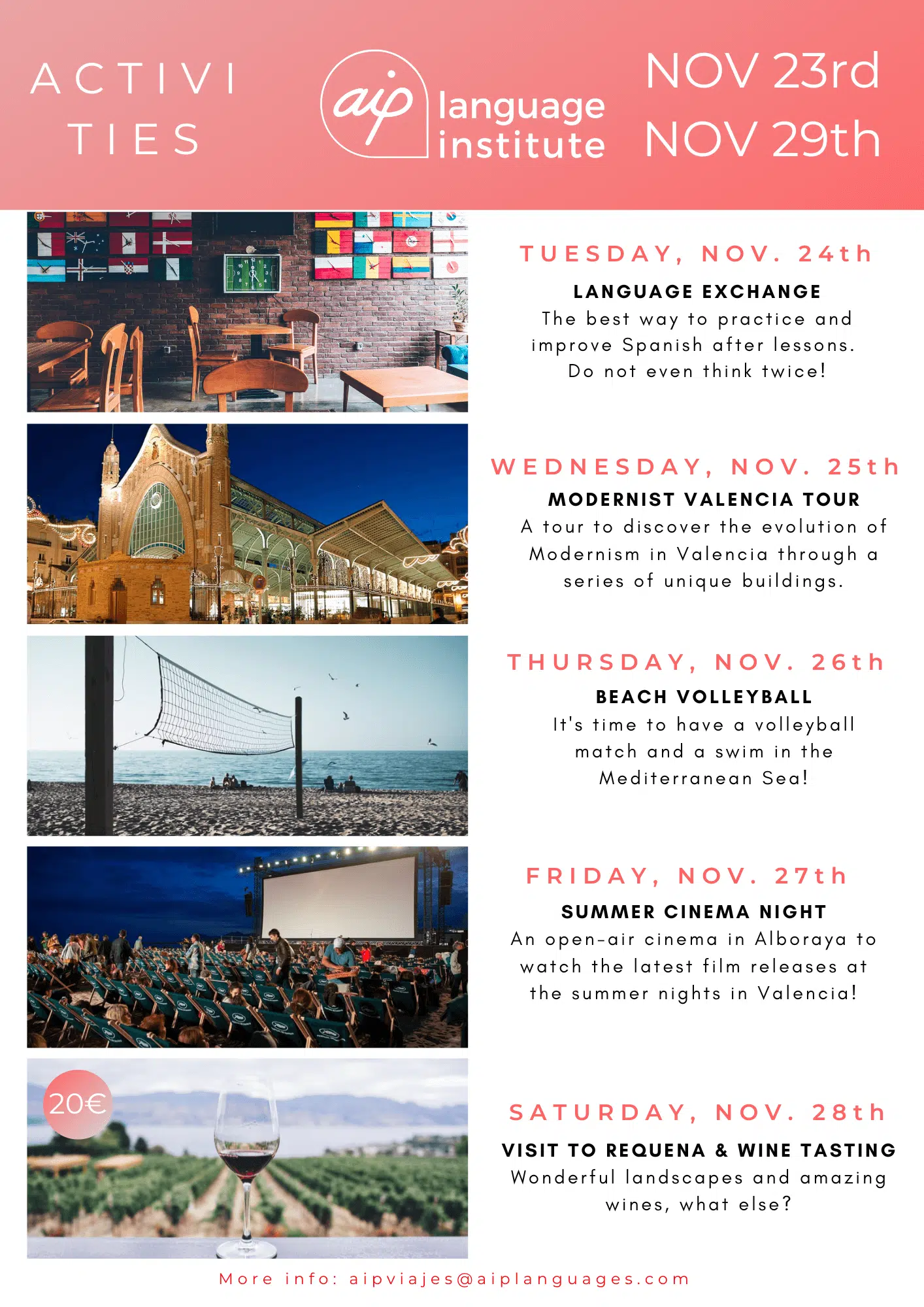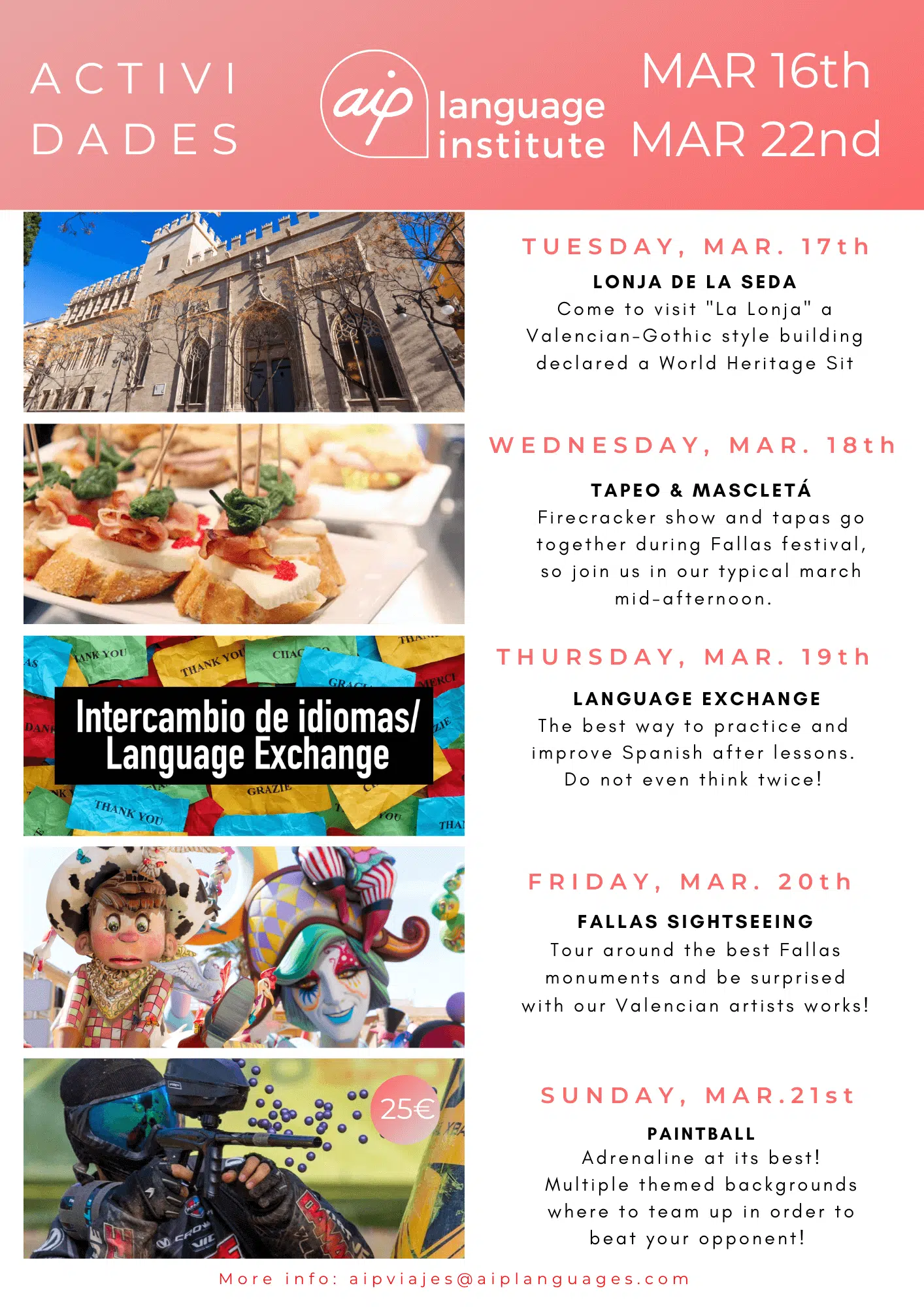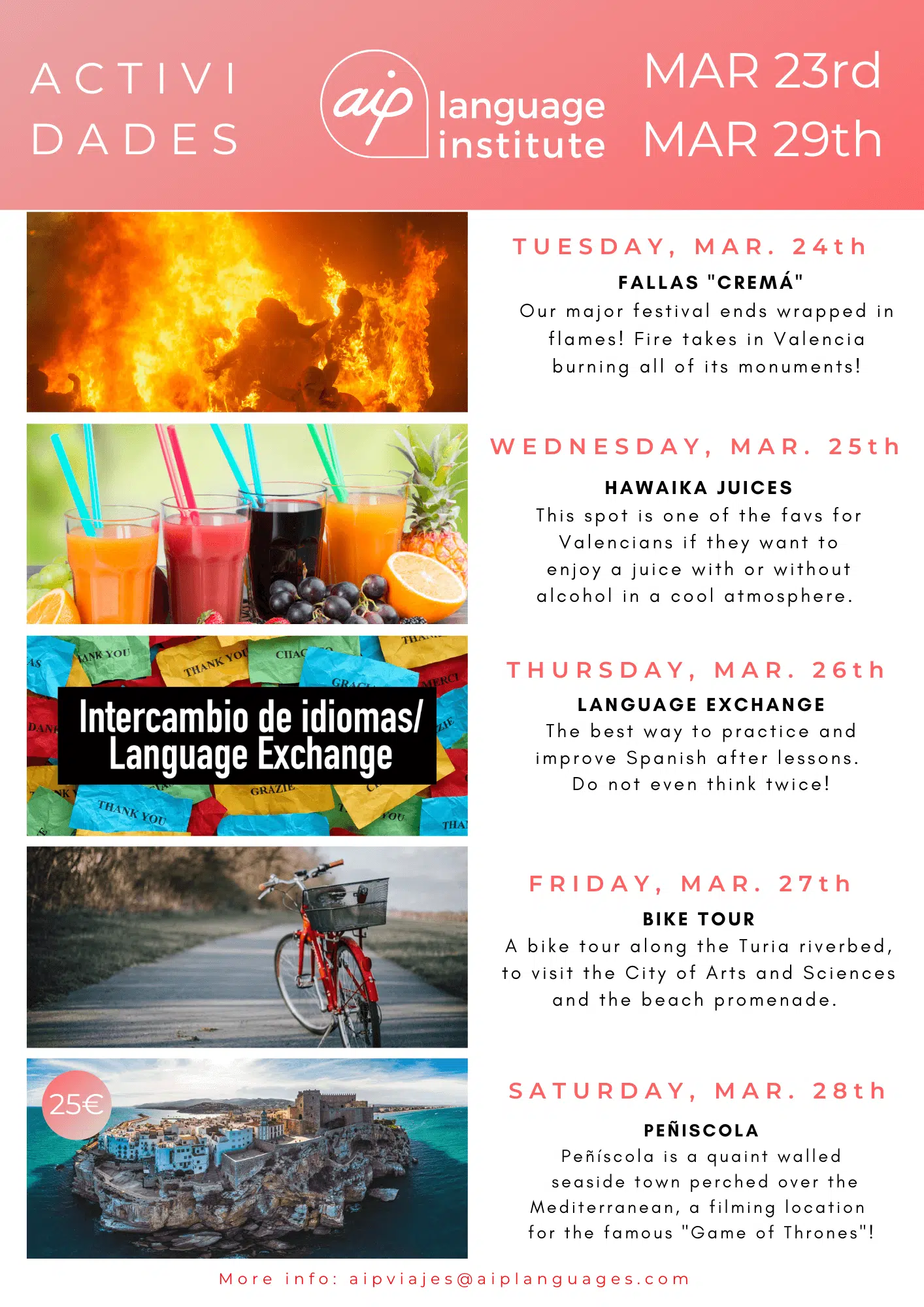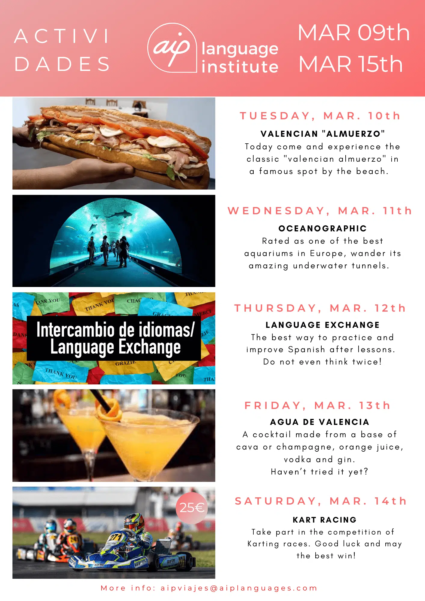 Om du funderar på att komma till Valencia för att studera en av våra kurser eller om du redan har bokat dina kursveckor kan du se vilka aktiviteter vi har organiserat. Klicka dig vidare nedan och upptäck alla överraskningar som vi har i beredskap för dig.
