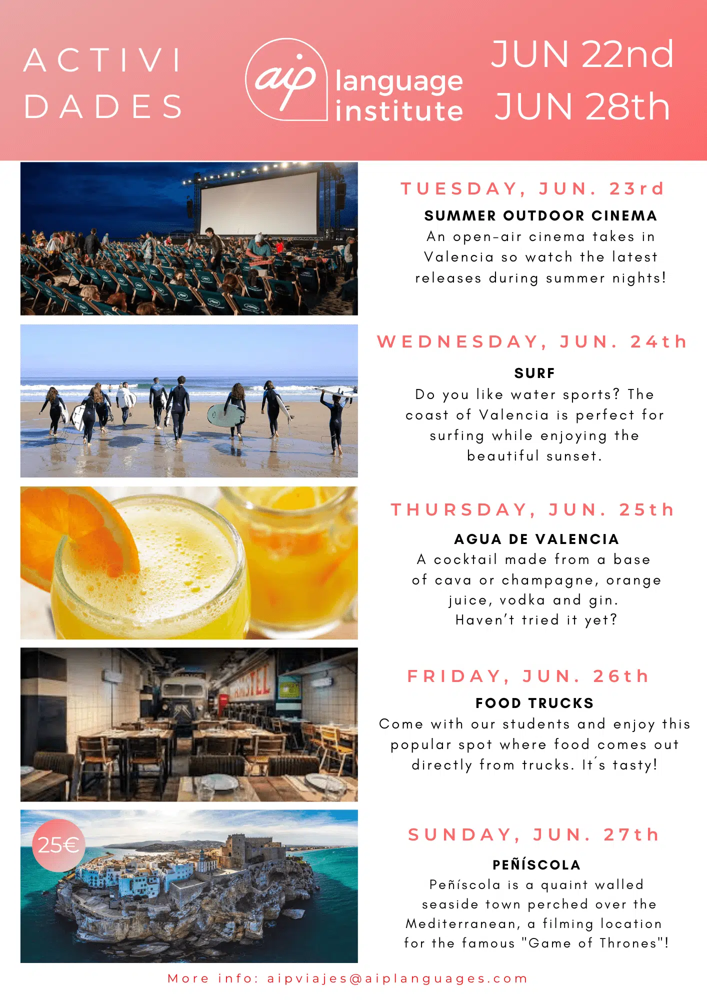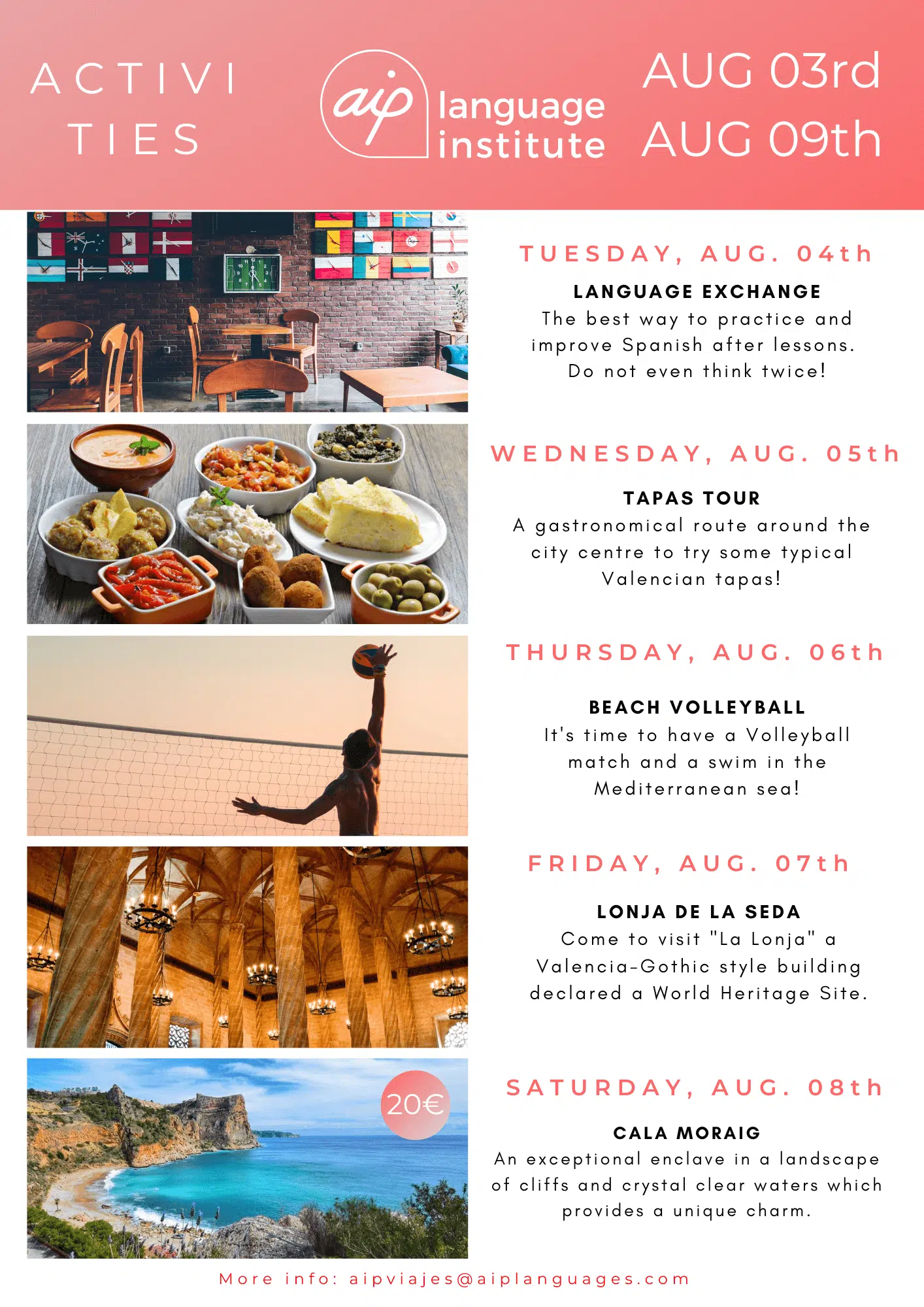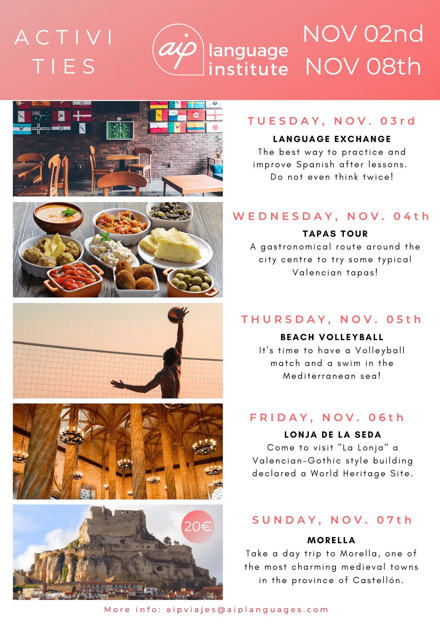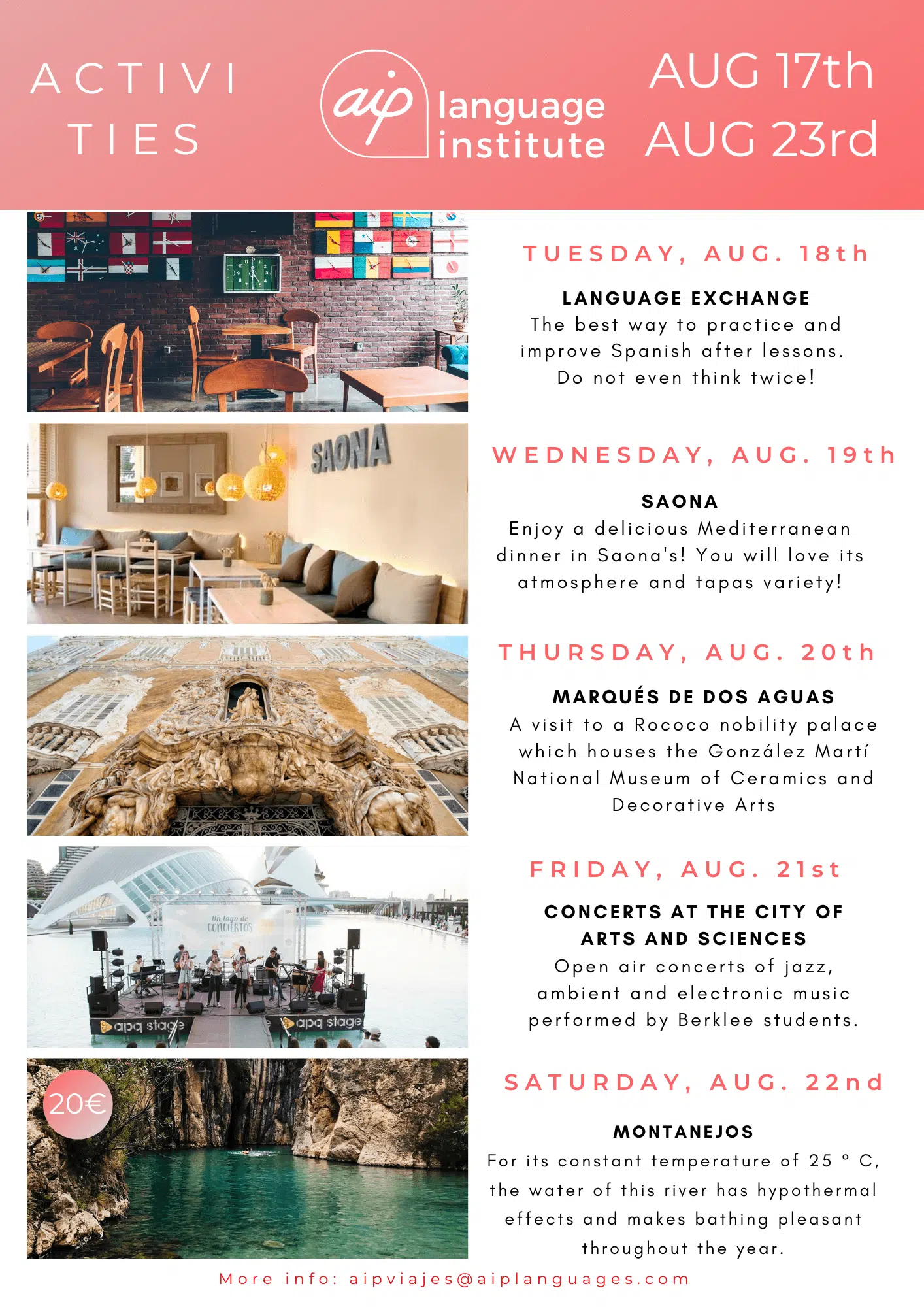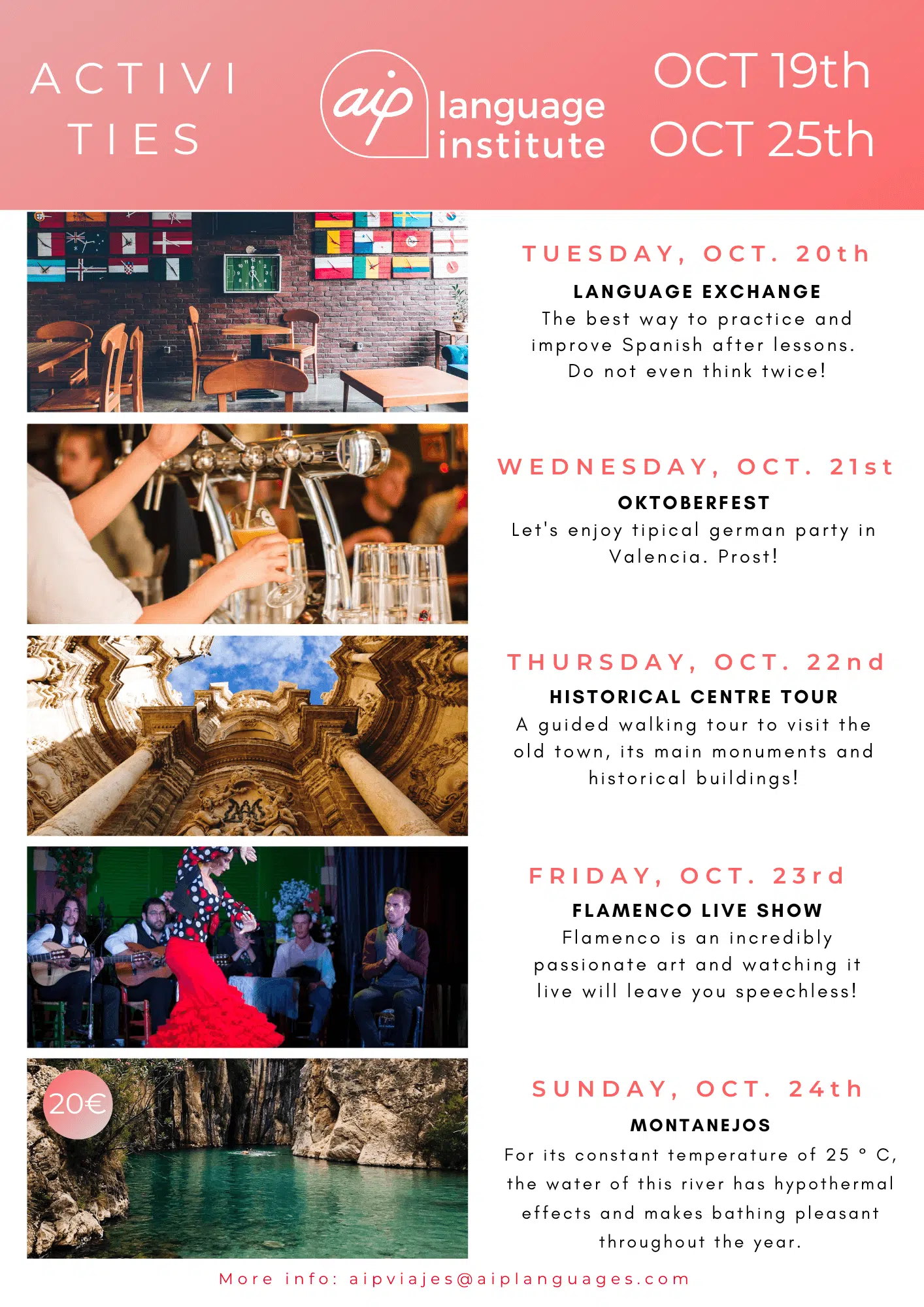 Om du funderar på att komma till Valencia för att studera en av våra kurser eller om du redan har bokat dina kursveckor kan du se vilka aktiviteter vi har organiserat. Klicka dig vidare nedan och upptäck alla överraskningar som vi har i beredskap för dig.
