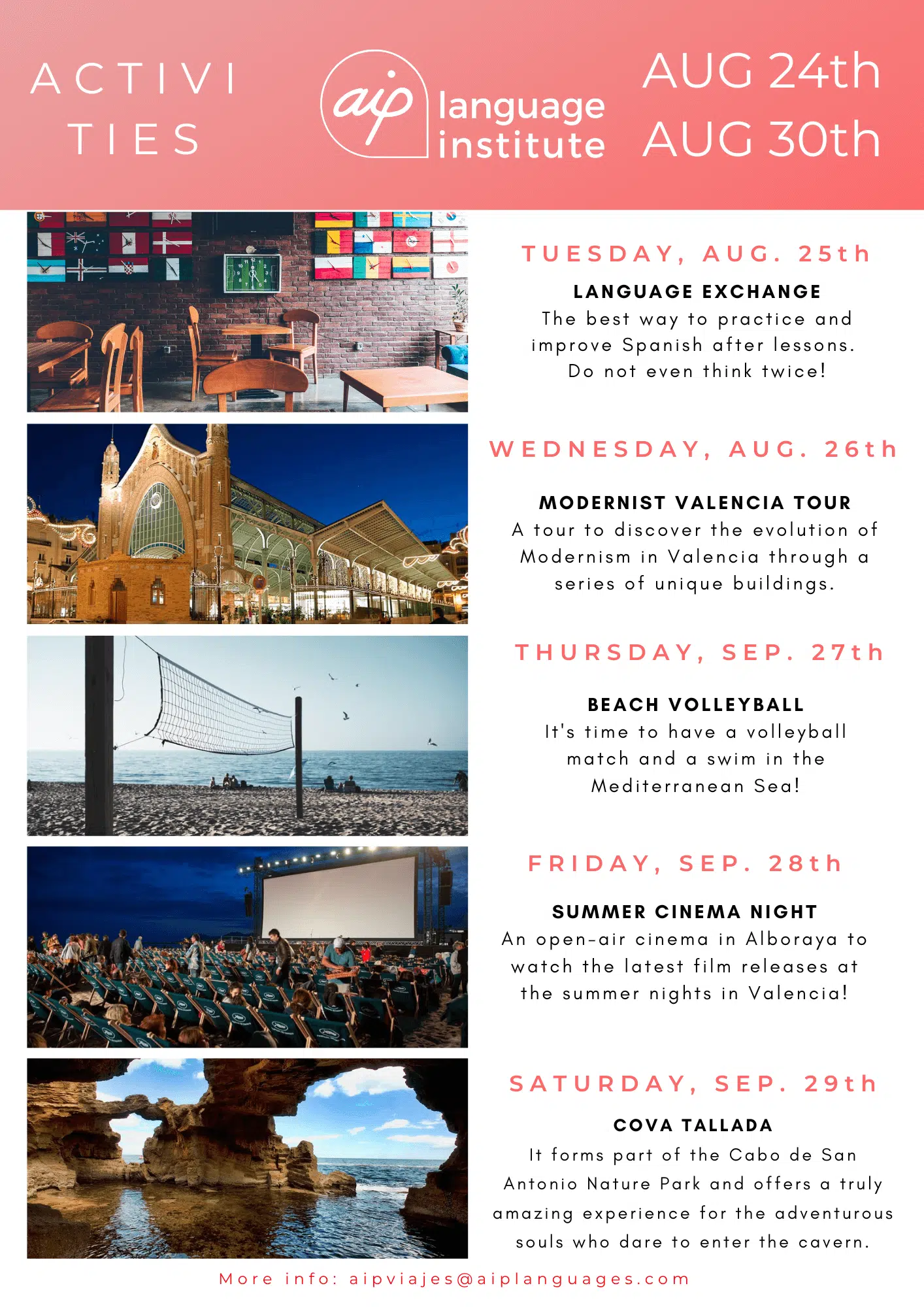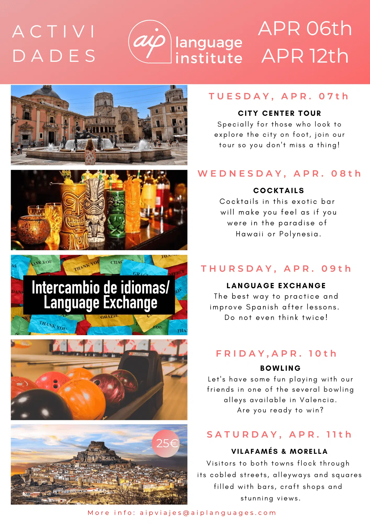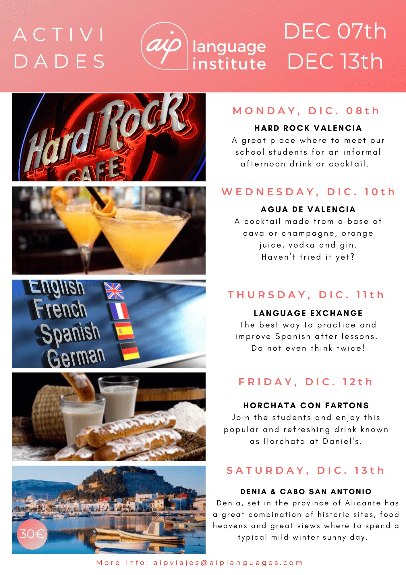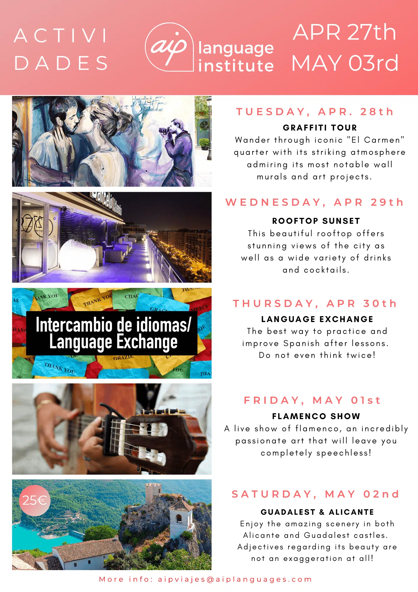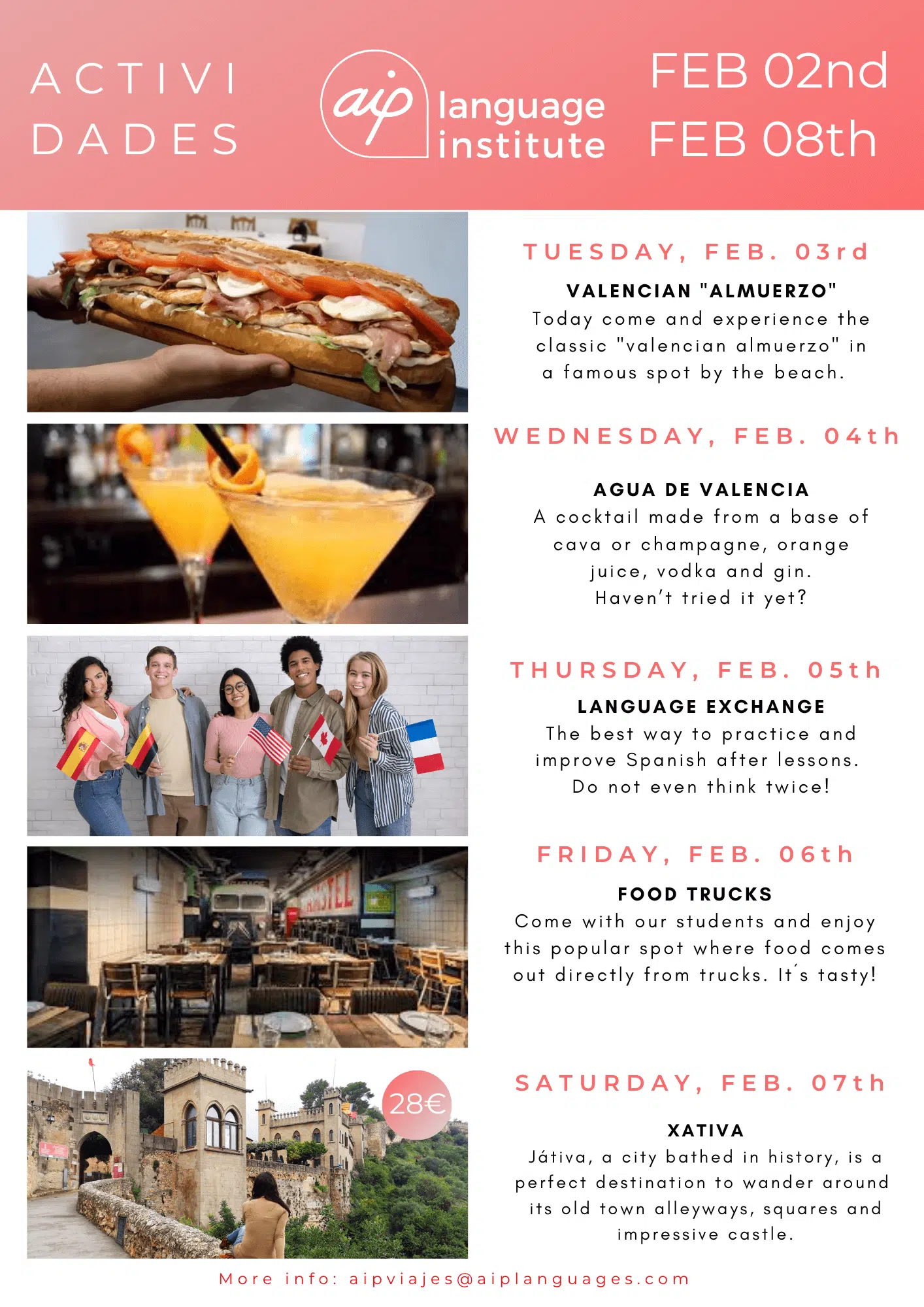 Skolan anordnar även minst tre kvälls- eller heldagsaktiviteter i veckan, som kan vara allt från spännande sightseeing i staden till helgutflykter för att upptäcka de bäst bevarade hemligheterna i Spanien. Gilla vår Facebooksida AIP Languages in Valencia för att hålla dig uppdaterad på varje veckas aktiviteter!