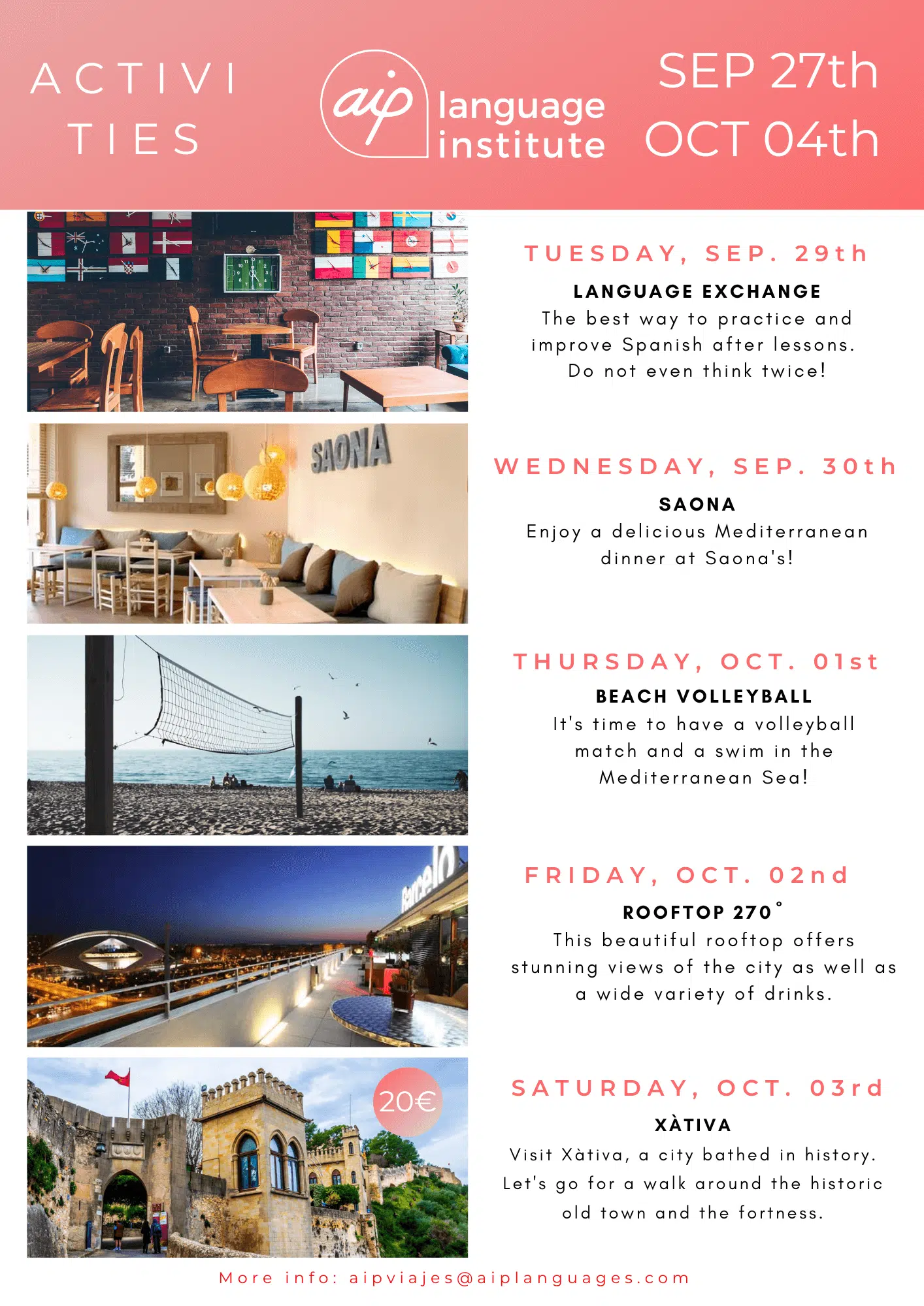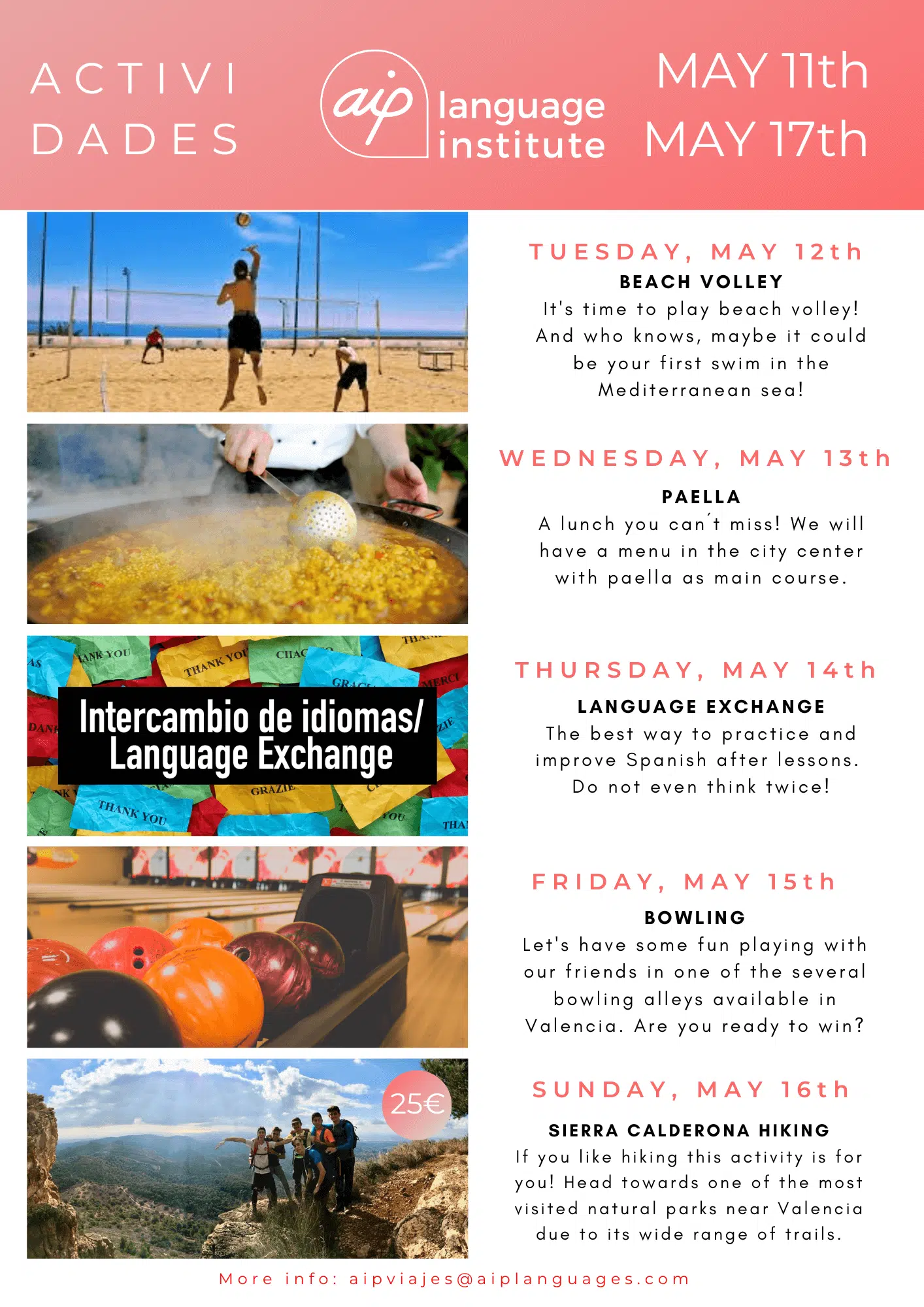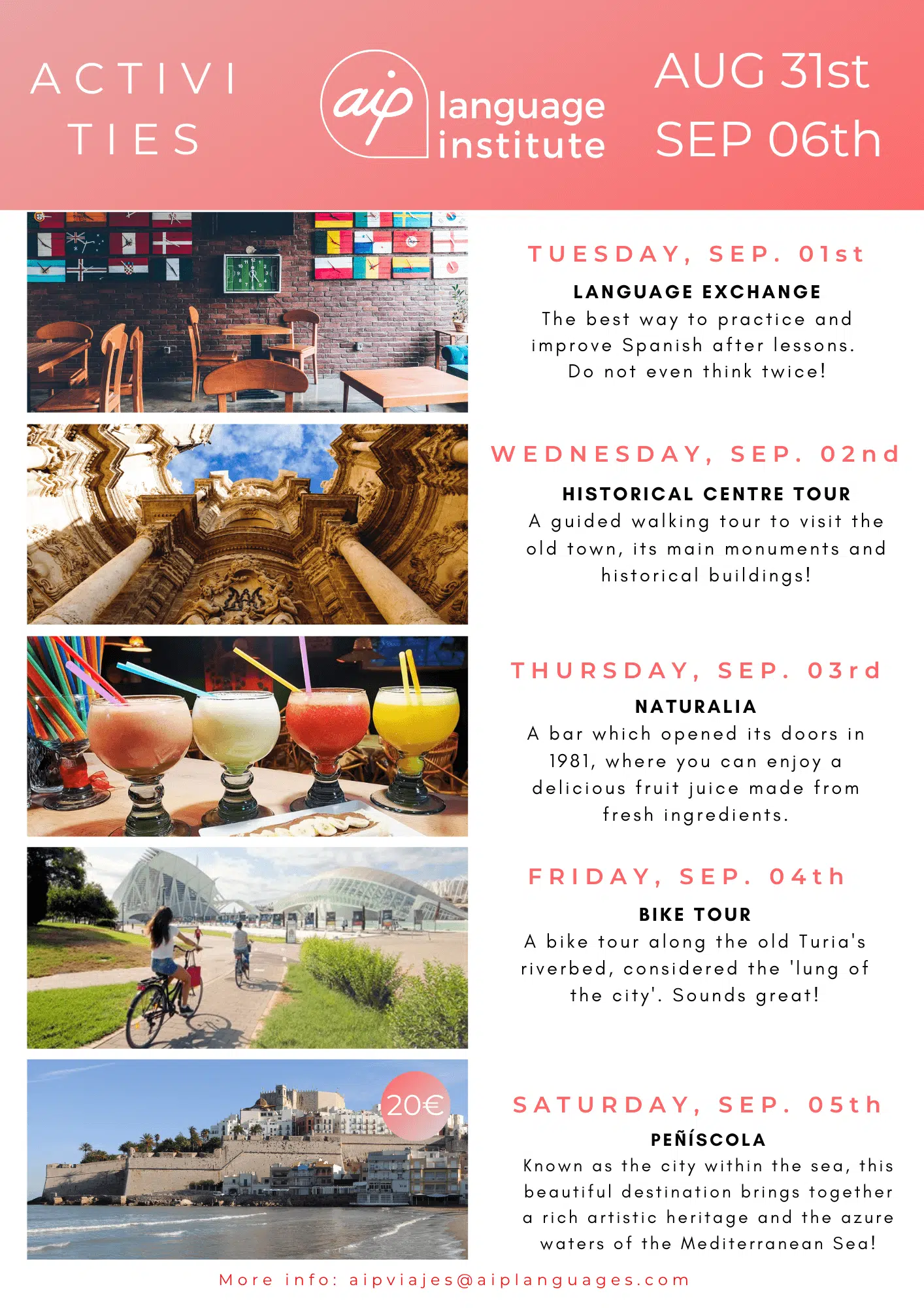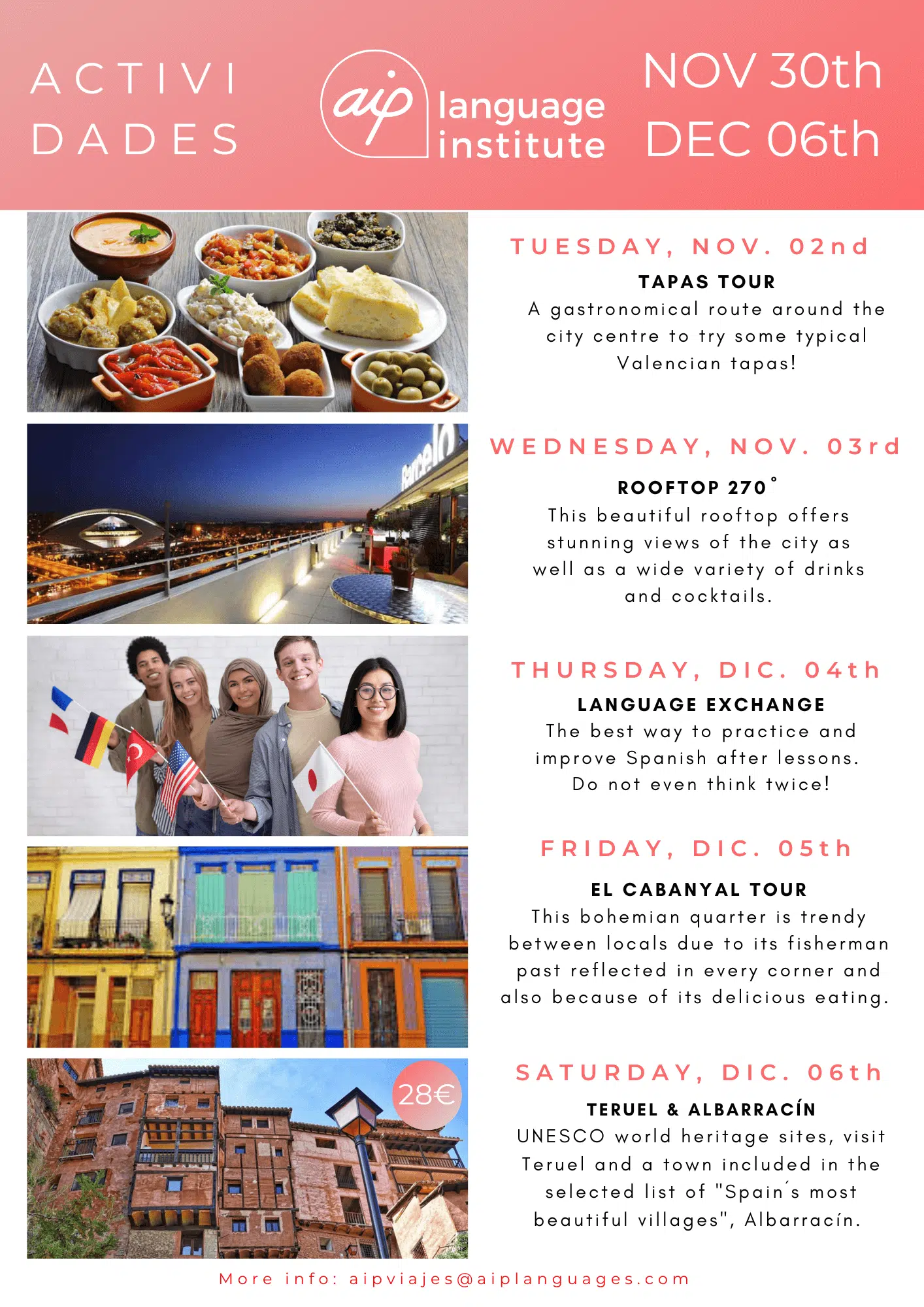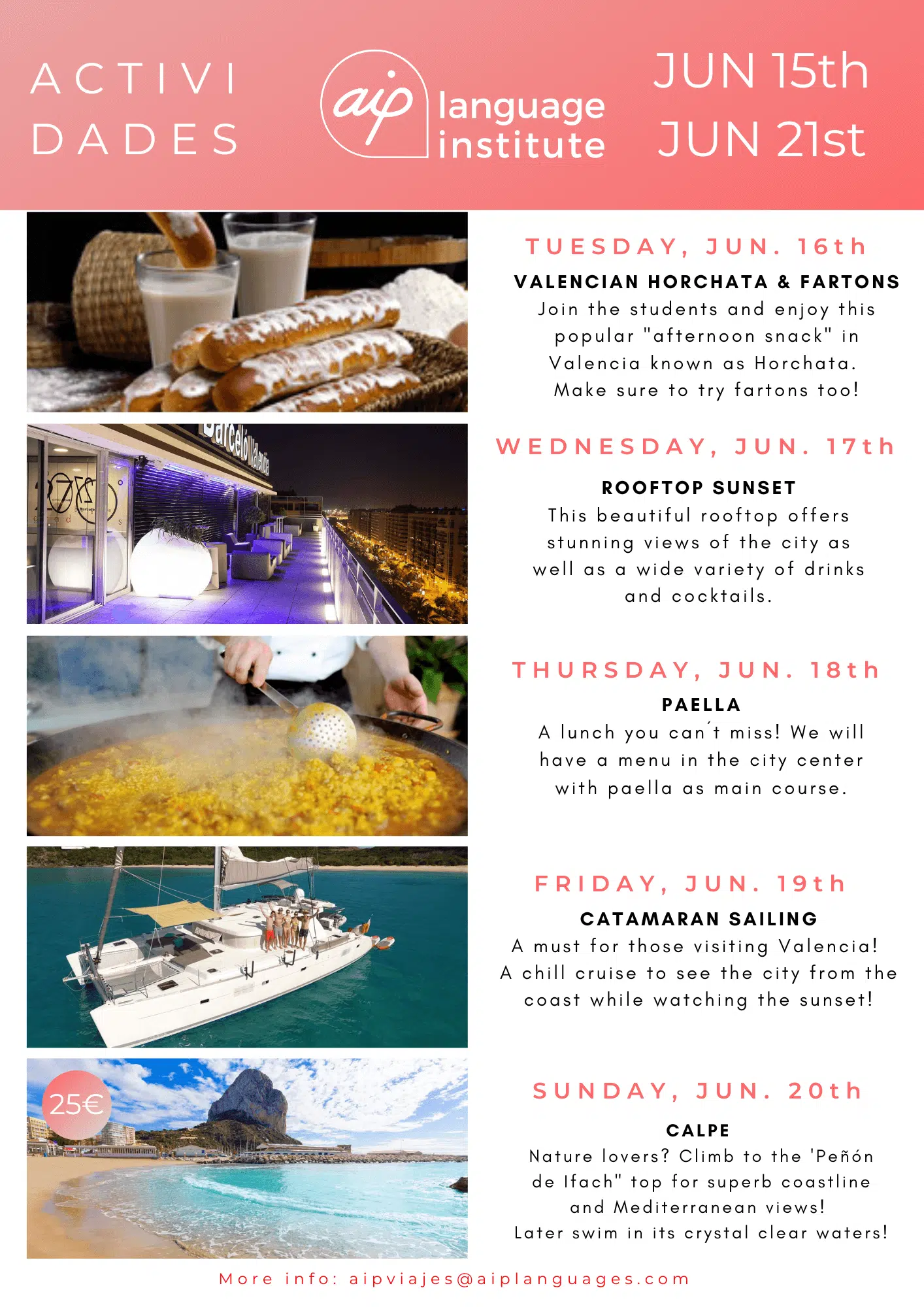 Skolan anordnar även minst tre kvälls- eller heldagsaktiviteter i veckan, som kan vara allt från spännande sightseeing i staden till helgutflykter för att upptäcka de bäst bevarade hemligheterna i Spanien. Gilla vår Facebooksida AIP Languages in Valencia för att hålla dig uppdaterad på varje veckas aktiviteter!