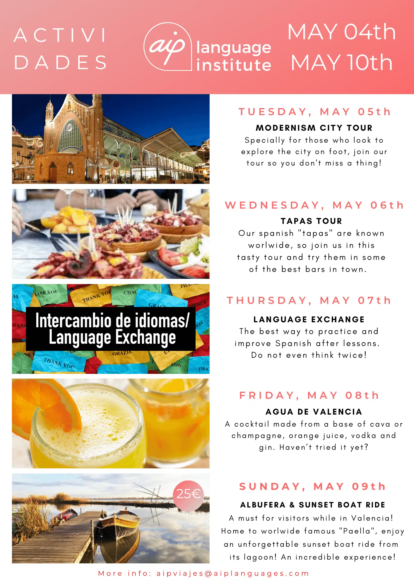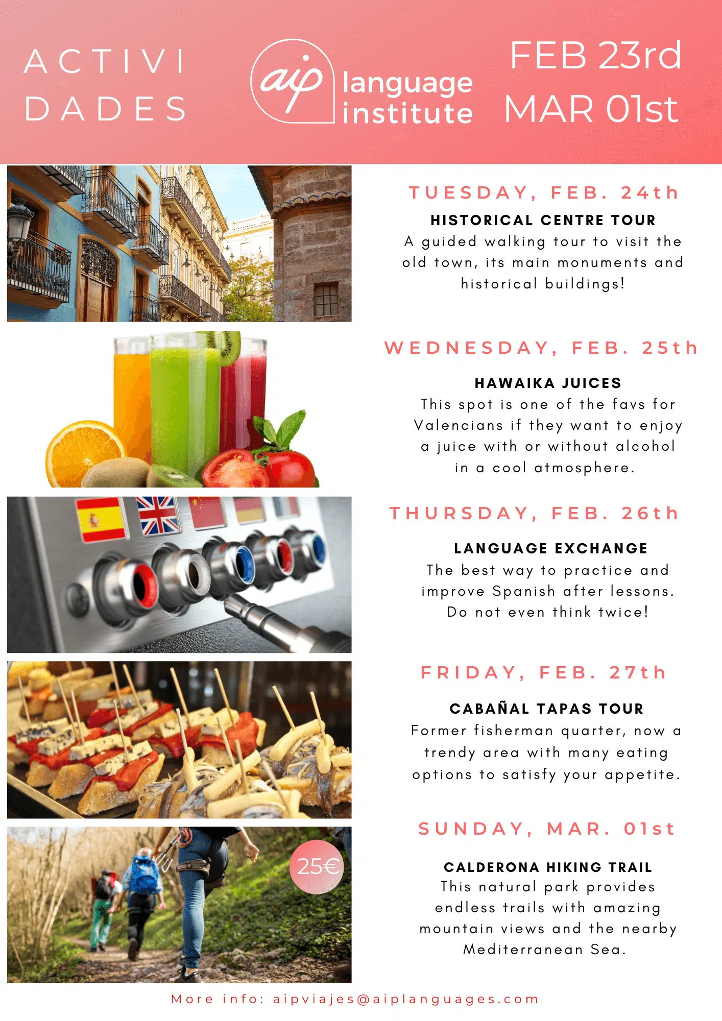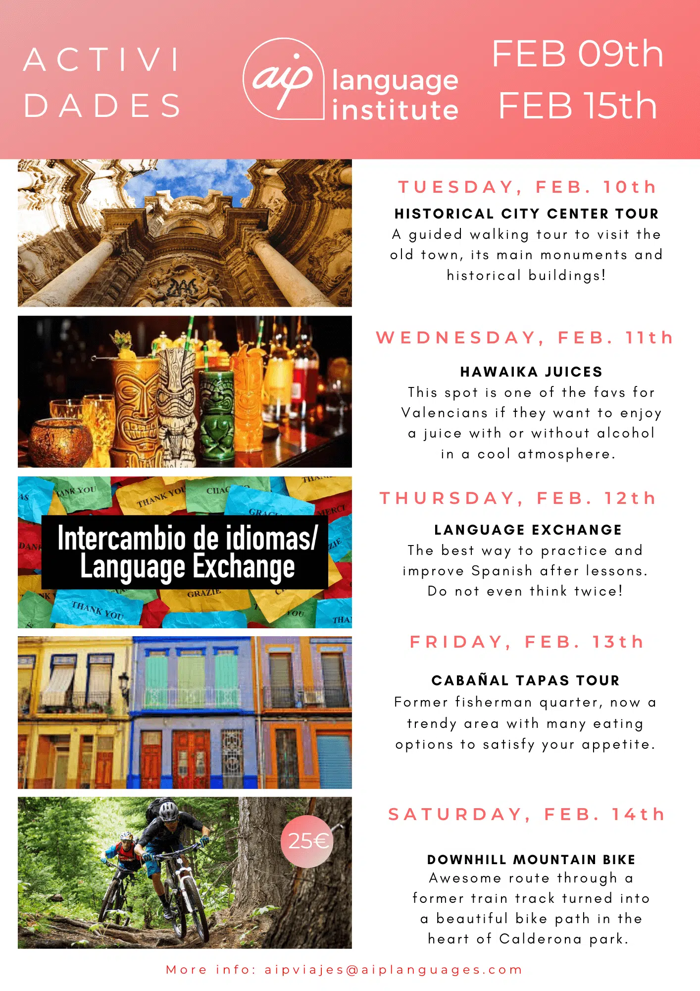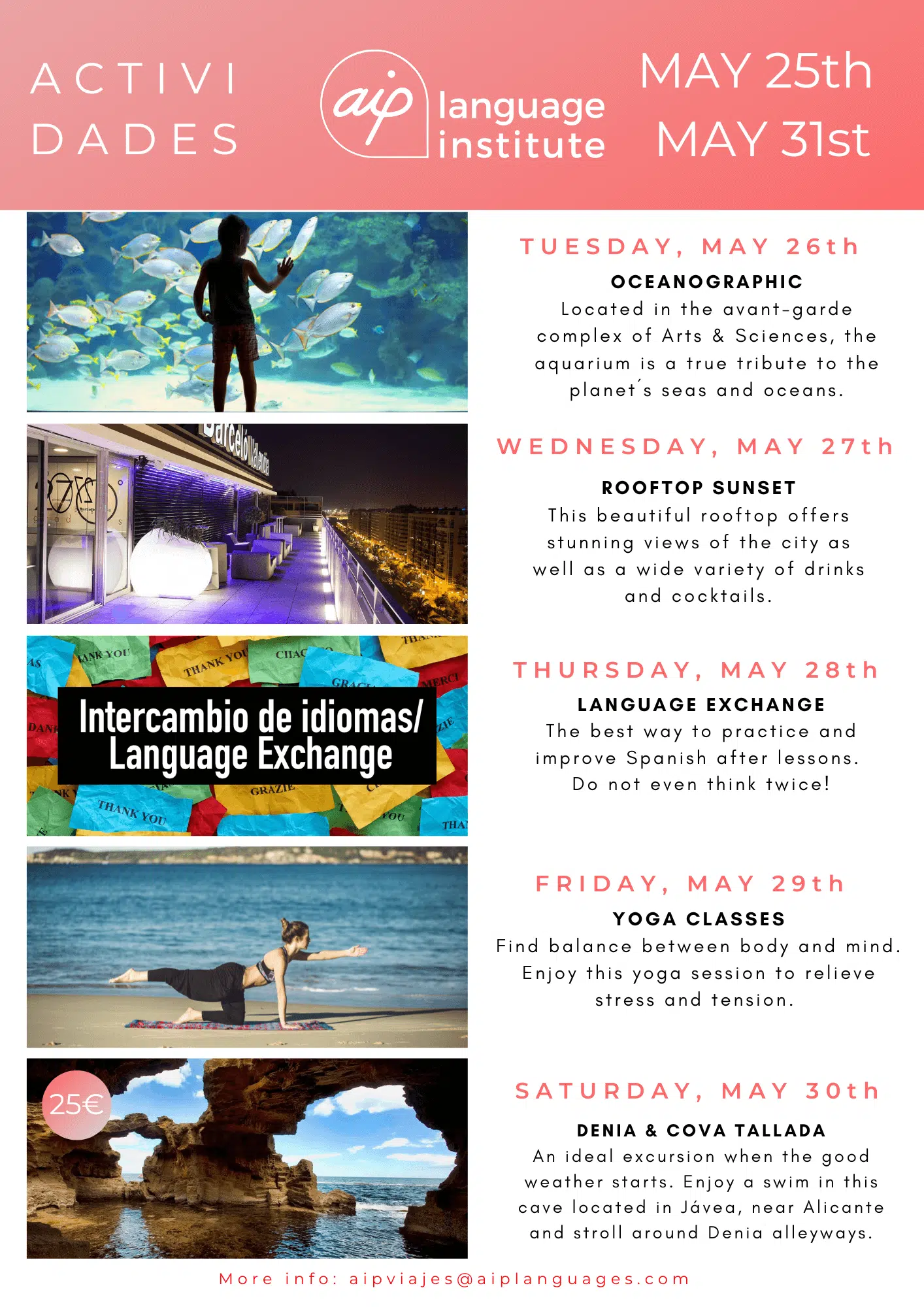 Skolan anordnar även minst tre kvälls- eller heldagsaktiviteter i veckan, som kan vara allt från spännande sightseeing i staden till helgutflykter för att upptäcka de bäst bevarade hemligheterna i Spanien. Gilla vår Facebooksida AIP Languages in Valencia för att hålla dig uppdaterad på varje veckas aktiviteter!