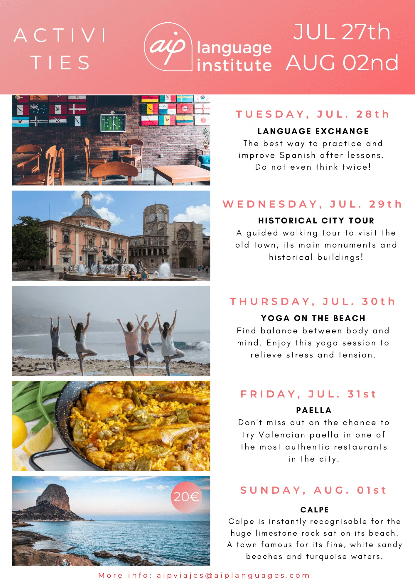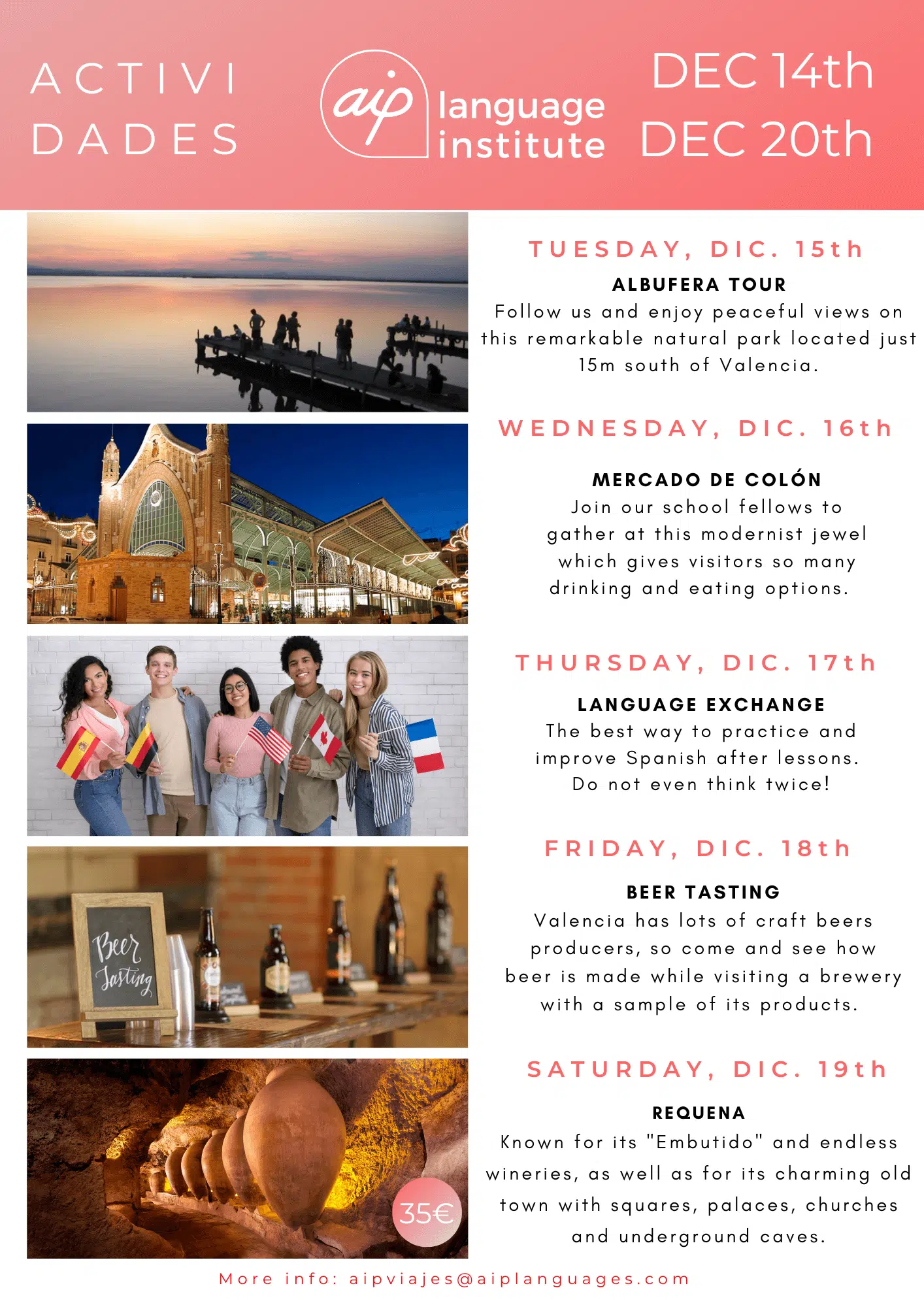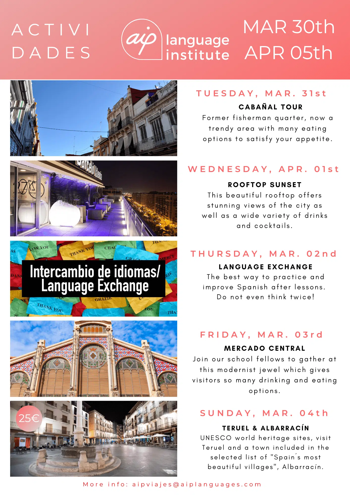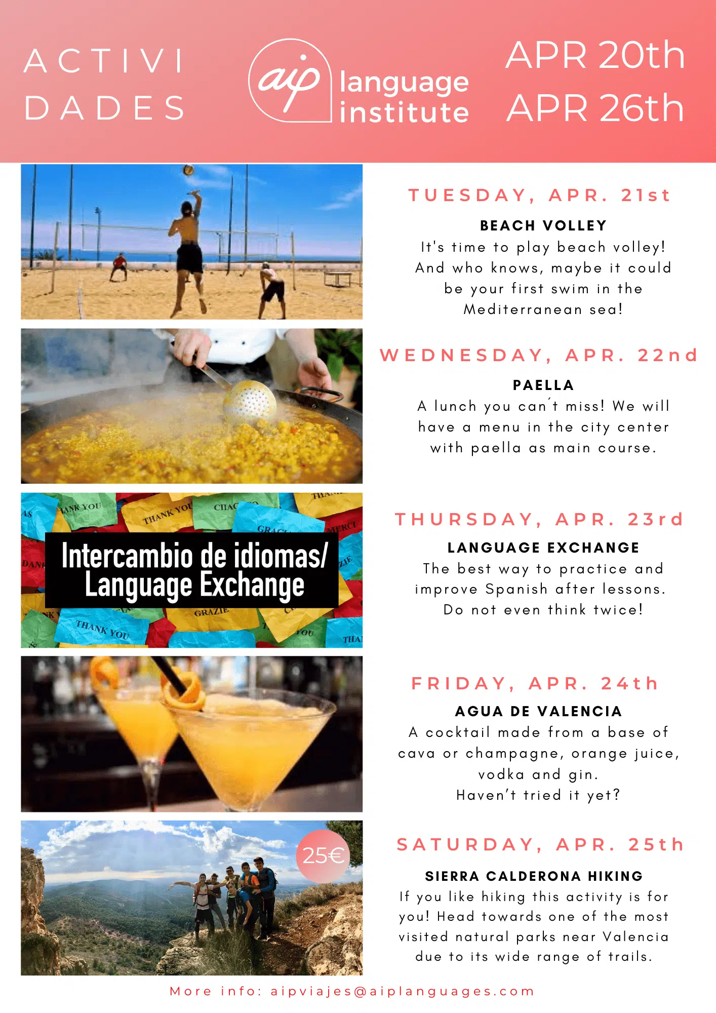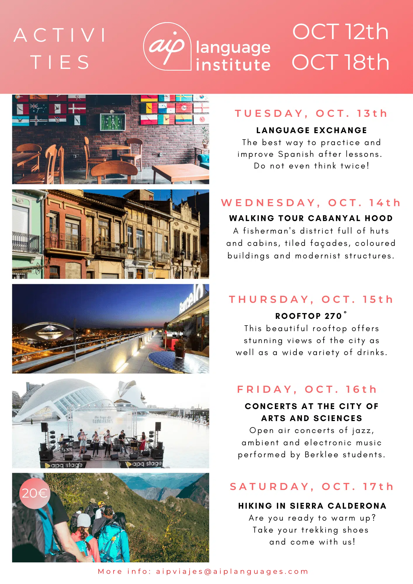 Skolan anordnar även minst tre kvälls- eller heldagsaktiviteter i veckan, som kan vara allt från spännande sightseeing i staden till helgutflykter för att upptäcka de bäst bevarade hemligheterna i Spanien. Gilla vår Facebooksida AIP Languages in Valencia för att hålla dig uppdaterad på varje veckas aktiviteter!