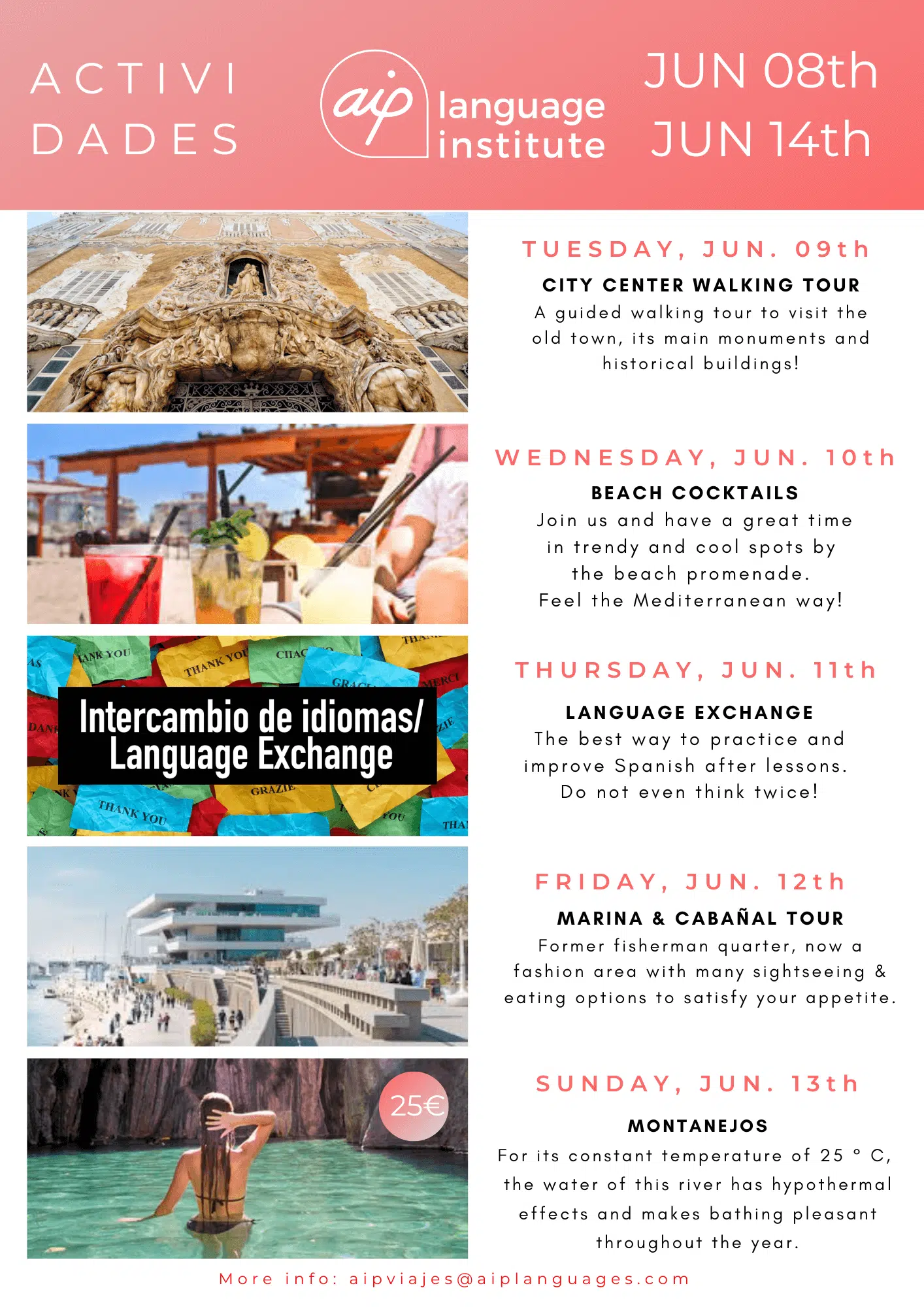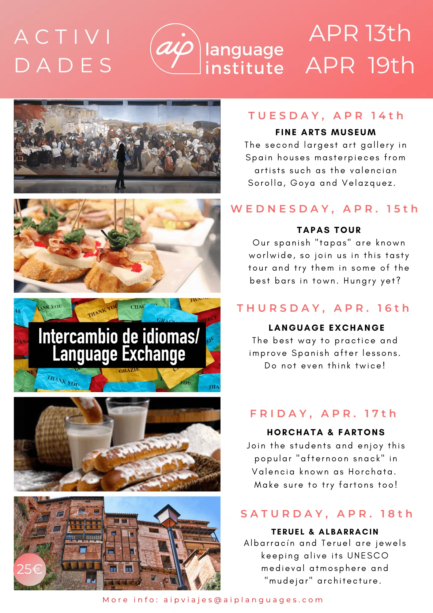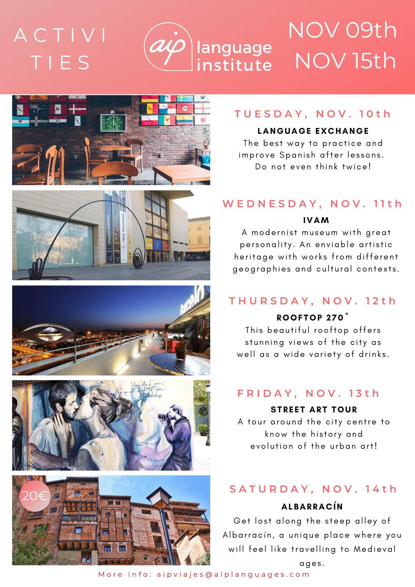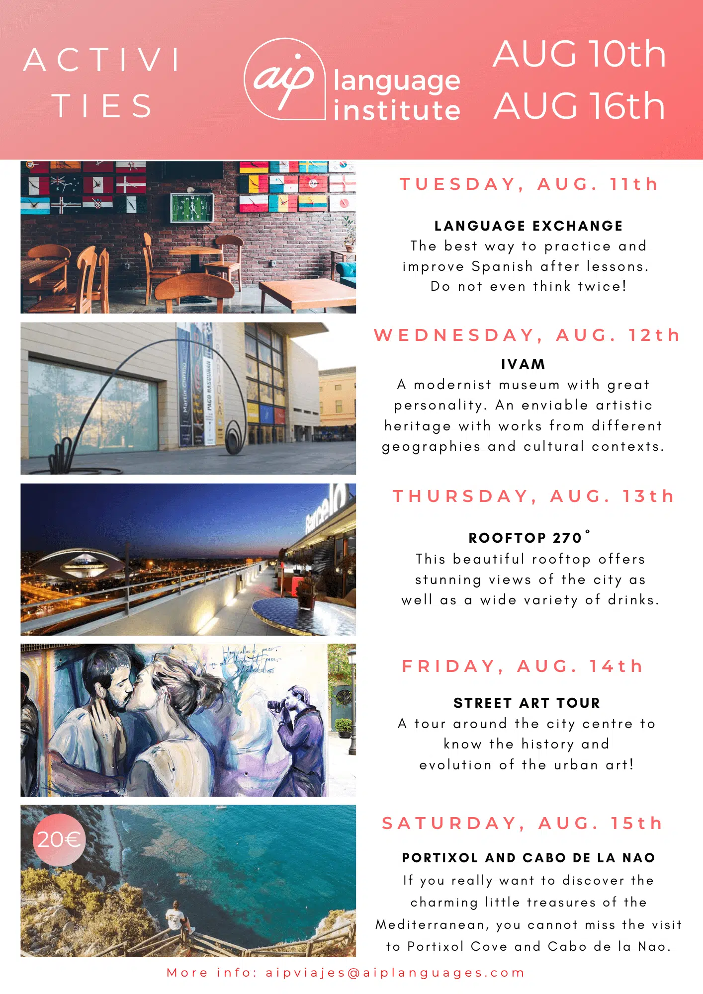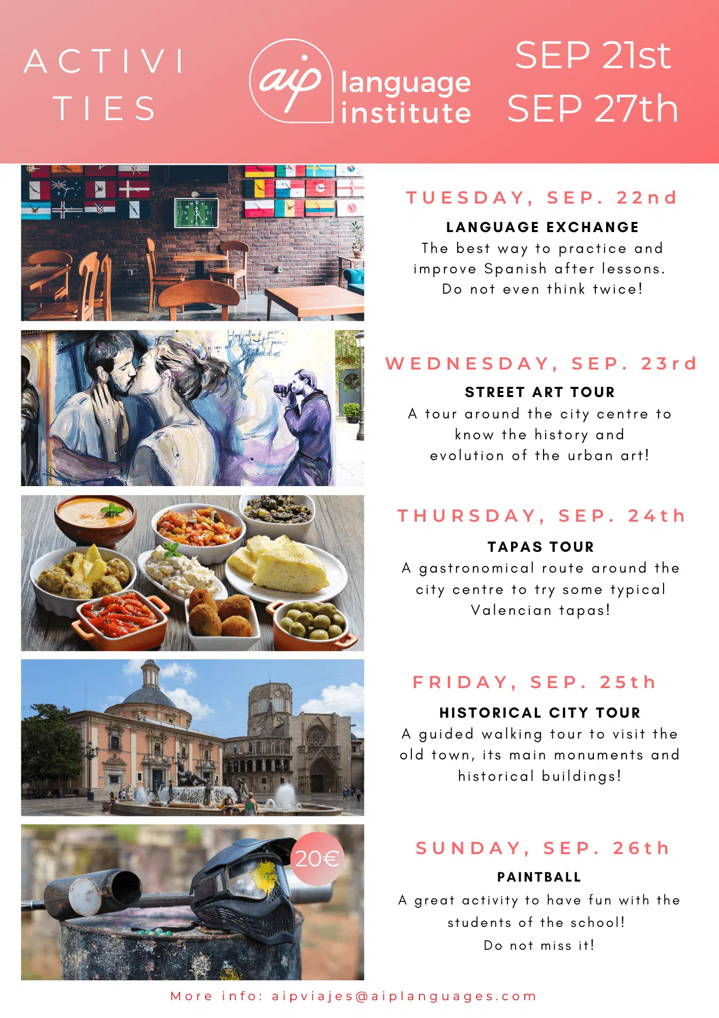 Skolan anordnar även minst tre kvälls- eller heldagsaktiviteter i veckan, som kan vara allt från spännande sightseeing i staden till helgutflykter för att upptäcka de bäst bevarade hemligheterna i Spanien. Gilla vår Facebooksida AIP Languages in Valencia för att hålla dig uppdaterad på varje veckas aktiviteter!