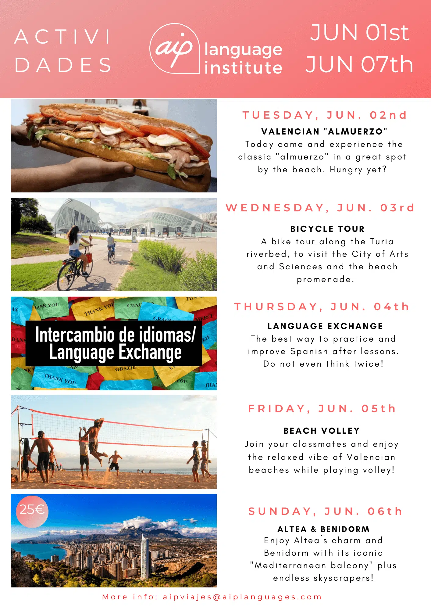 Du kommer att använda din fritid till shopping, besök av intressanta platser i staden, nya sporter och kvällar på barer och nattklubbar med dina nya kompisar. Det faktum att skolan ligger i hjärtat av Valencia gör det lätt att njuta av vad staden har ett erbjuda! Om du känner dig osäker på var du ska börja finns vi på AIP tillhands och ger dig den information du behöver om vad du kan göra på din fritid!